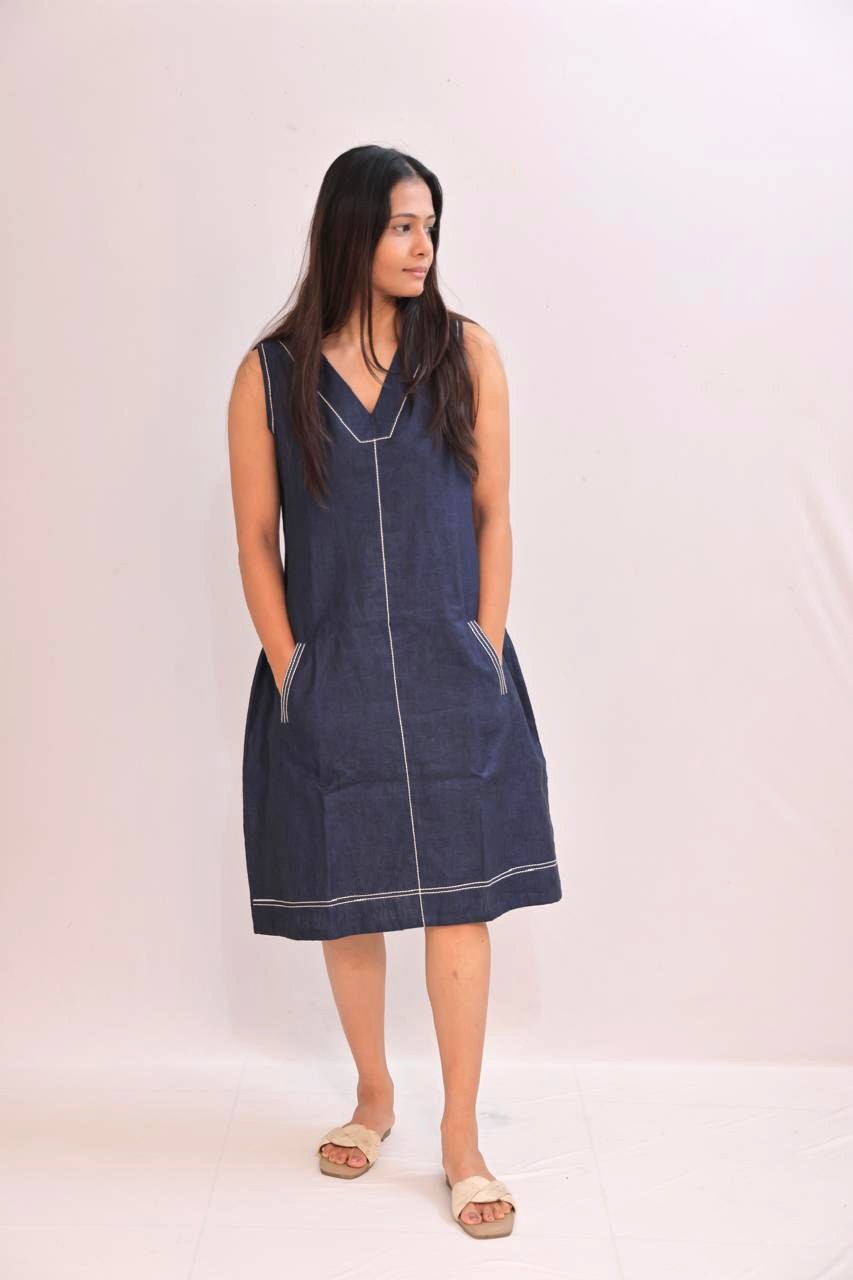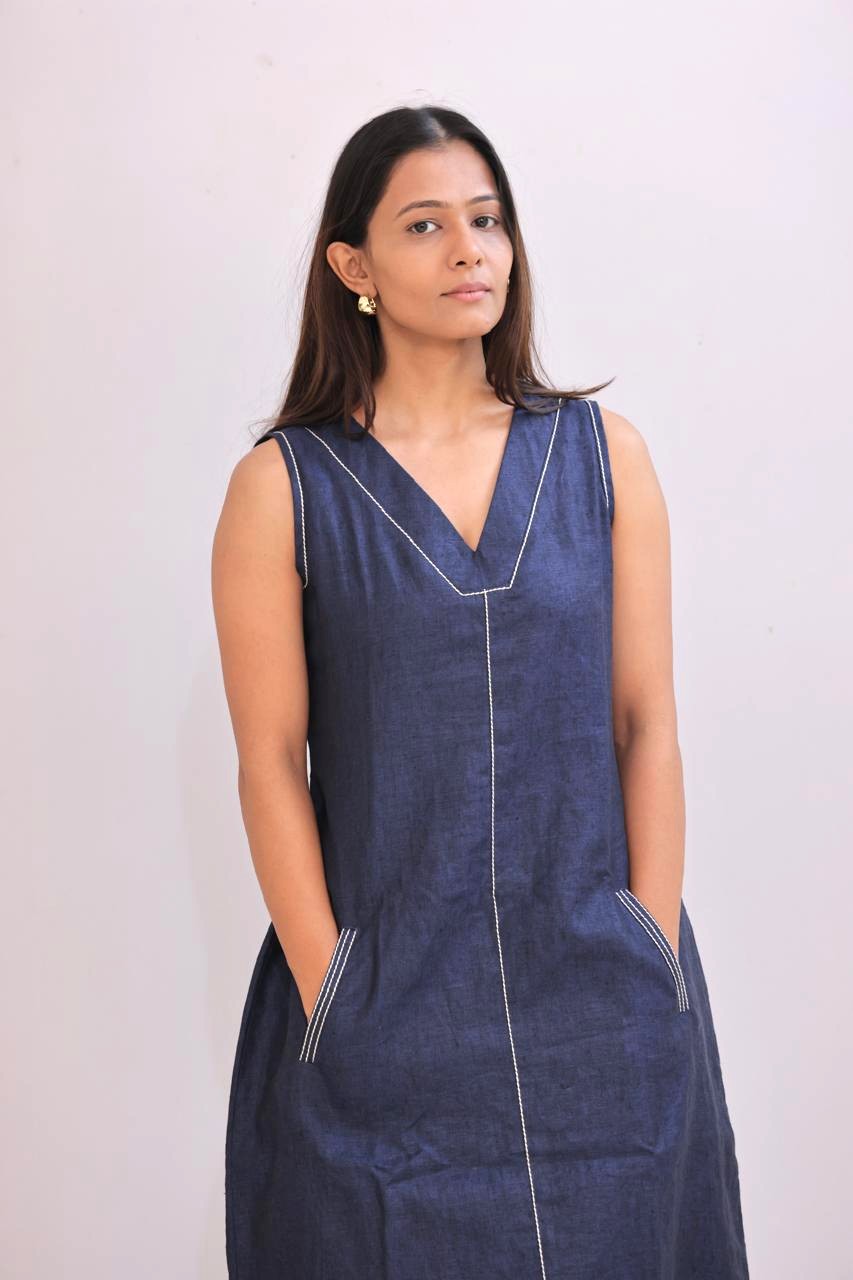 The Kasha dress is an easy everyday piece designed for comfort and function. Made in breathable linen, it features clean tailoring, a relaxed A-line fit, and two practical side pockets. The visible white thread work adds sharpness to the deep indigo base, giving the look a subtle highlight without being loud. Works well for everyday wear, casual meetings, or a quick step out.