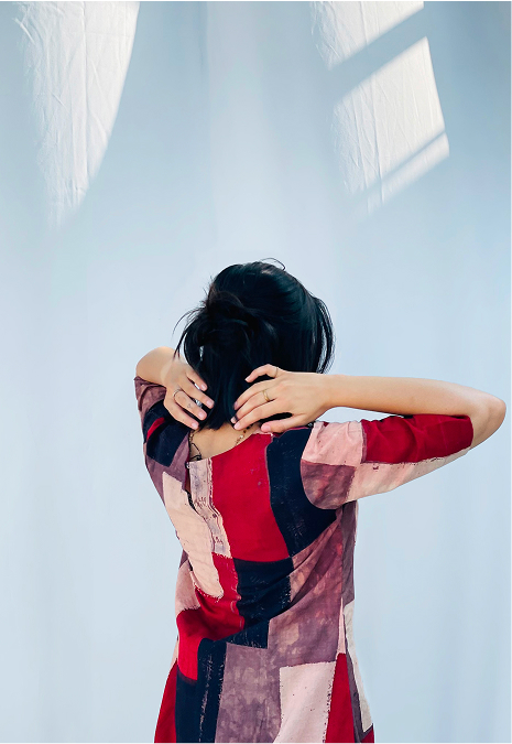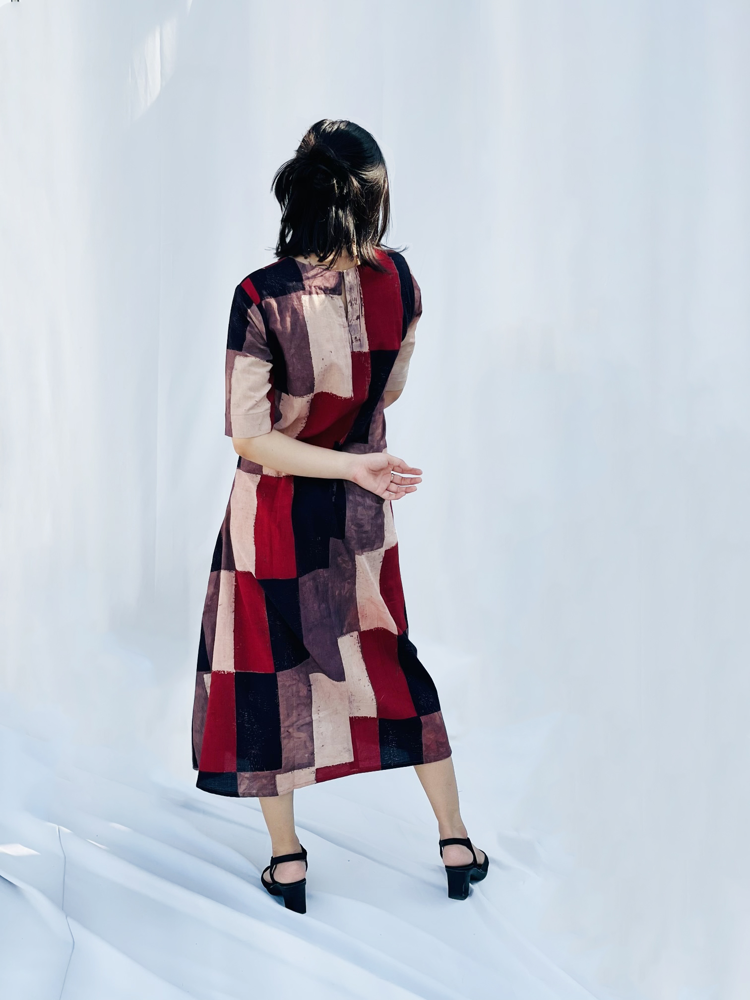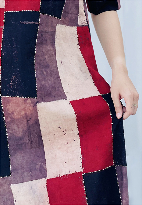 The IRA dress is a celebration of movement, balance, and hand-crafted artistry. Featuring a relaxed A-line silhouette, this piece is designed using block-patched panels in earthy reds, mauves, and indigo shades—each hand-dyed to express the uniqueness of reclaimed fabrics.