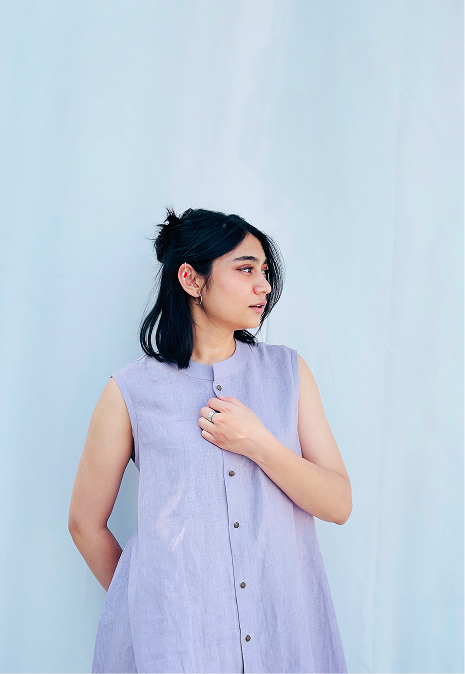 Saadgi Model height is 5’1″ and is wearing a Size S. Crafted from a breathable Linen-Cotton blend, this sleeveless shirt in a muted dusty lilac hue features a high collar neckline and dainty metal buttons for a clean, minimal look. Lightweight and relaxed, it’s perfect for warm weather dressing. Styled here with straight-cut linen pants for an effortless, monochrome silhouette—easy, elegant, and all-day comfortable.