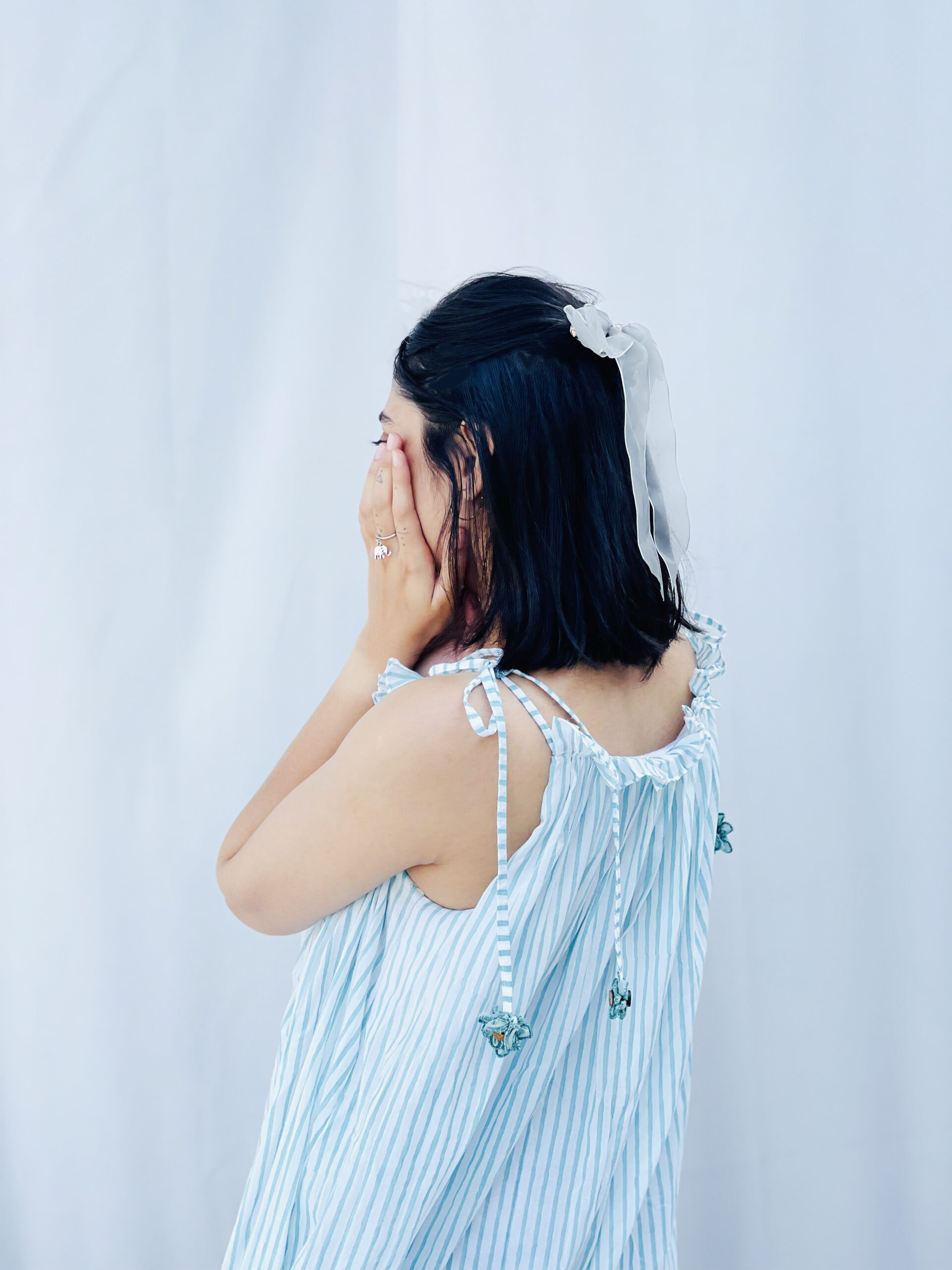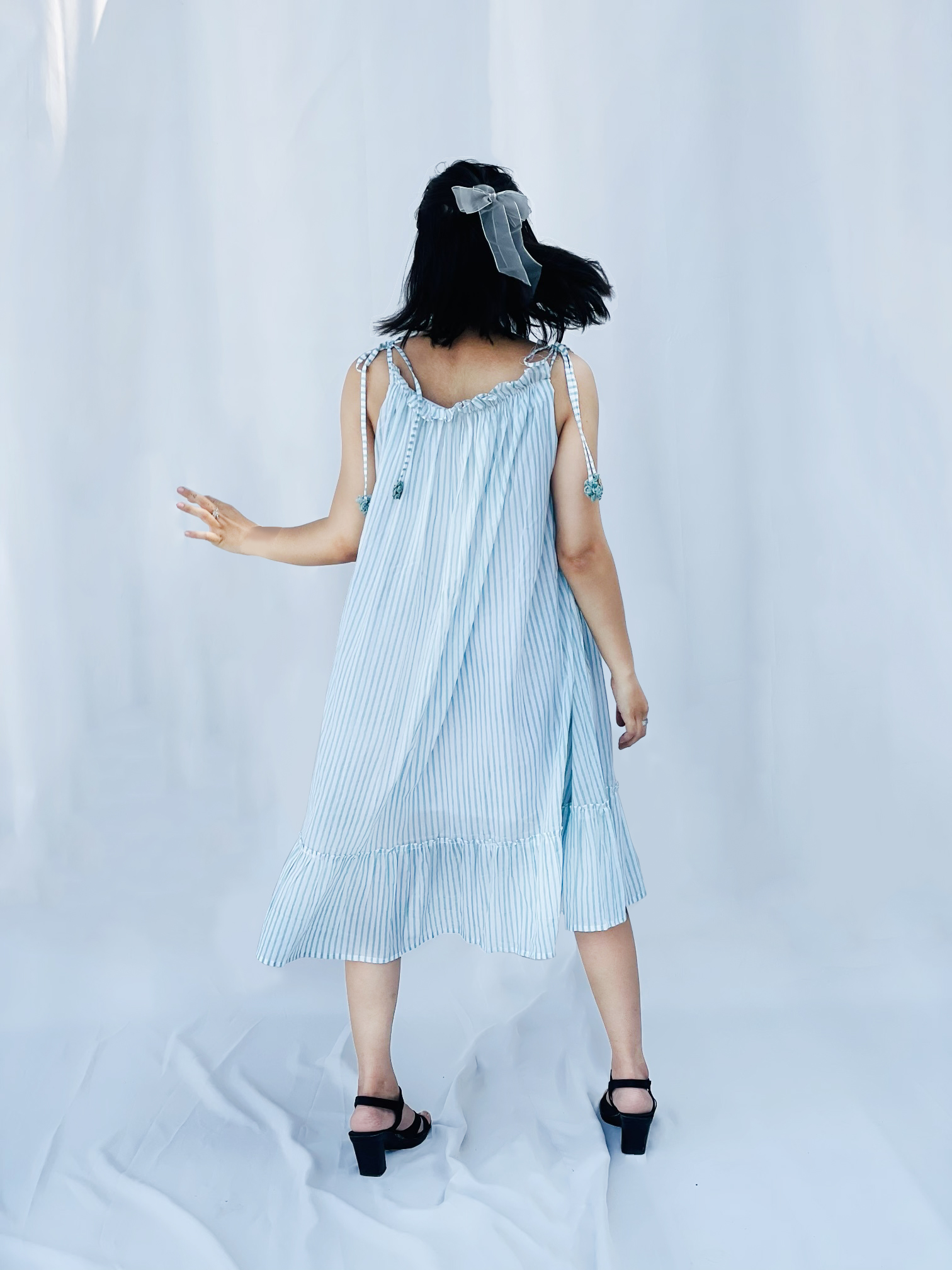 Sway Model height is 5’1″ and is wearing a Size S. A breezy, easygoing summer dress made in feather-light mal cotton, designed for days when you just want to twirl and float through the heat. The soothing sky-blue and white stripes are paired with delicate shoulder ties finished with handcrafted flower tassels and tiny wooden buttons — because details matter. A soft frill at the hem adds that subtle drama, giving the dress a swingy silhouette that moves with you.